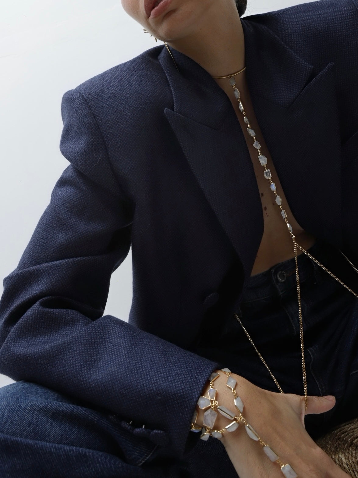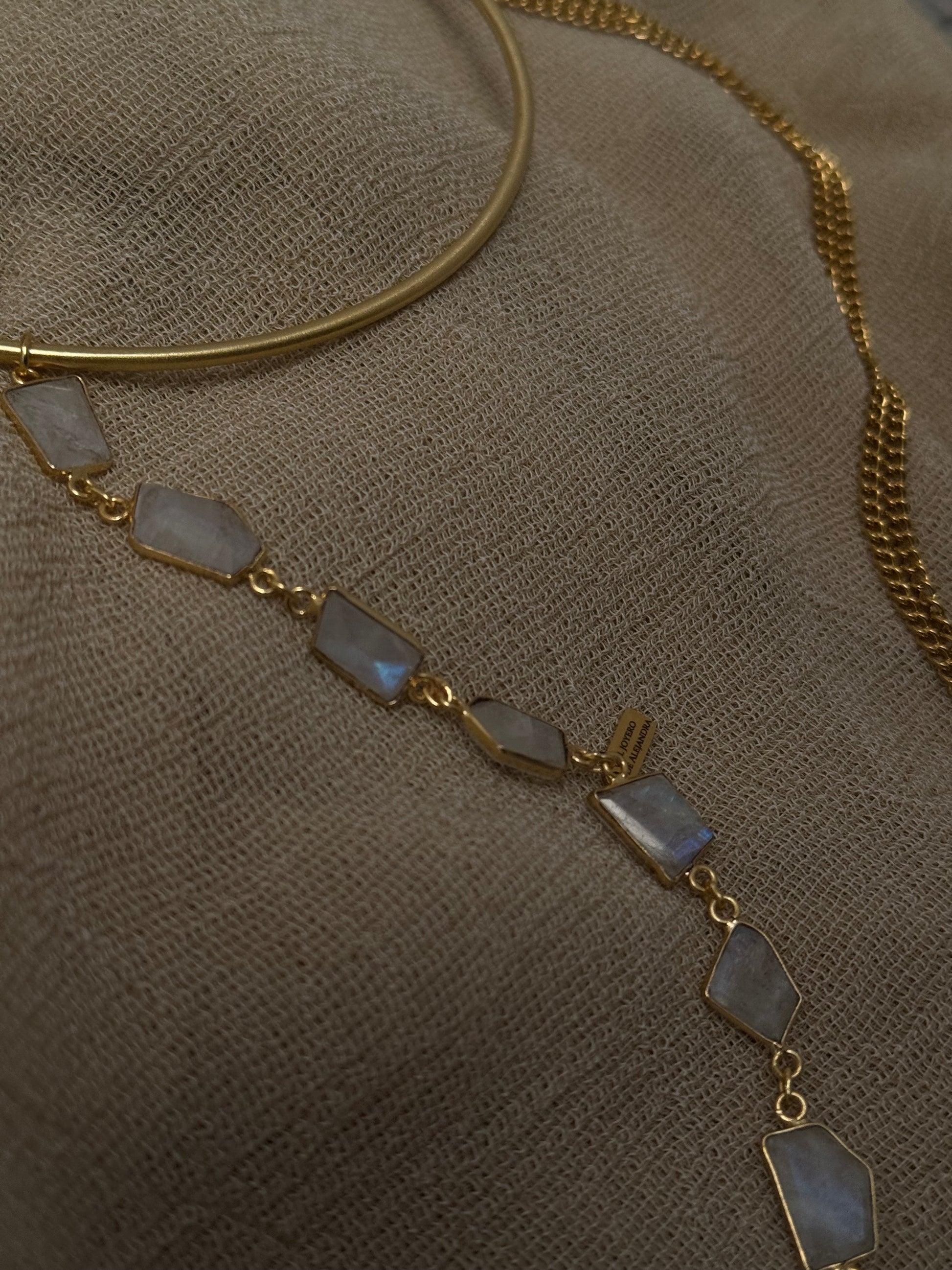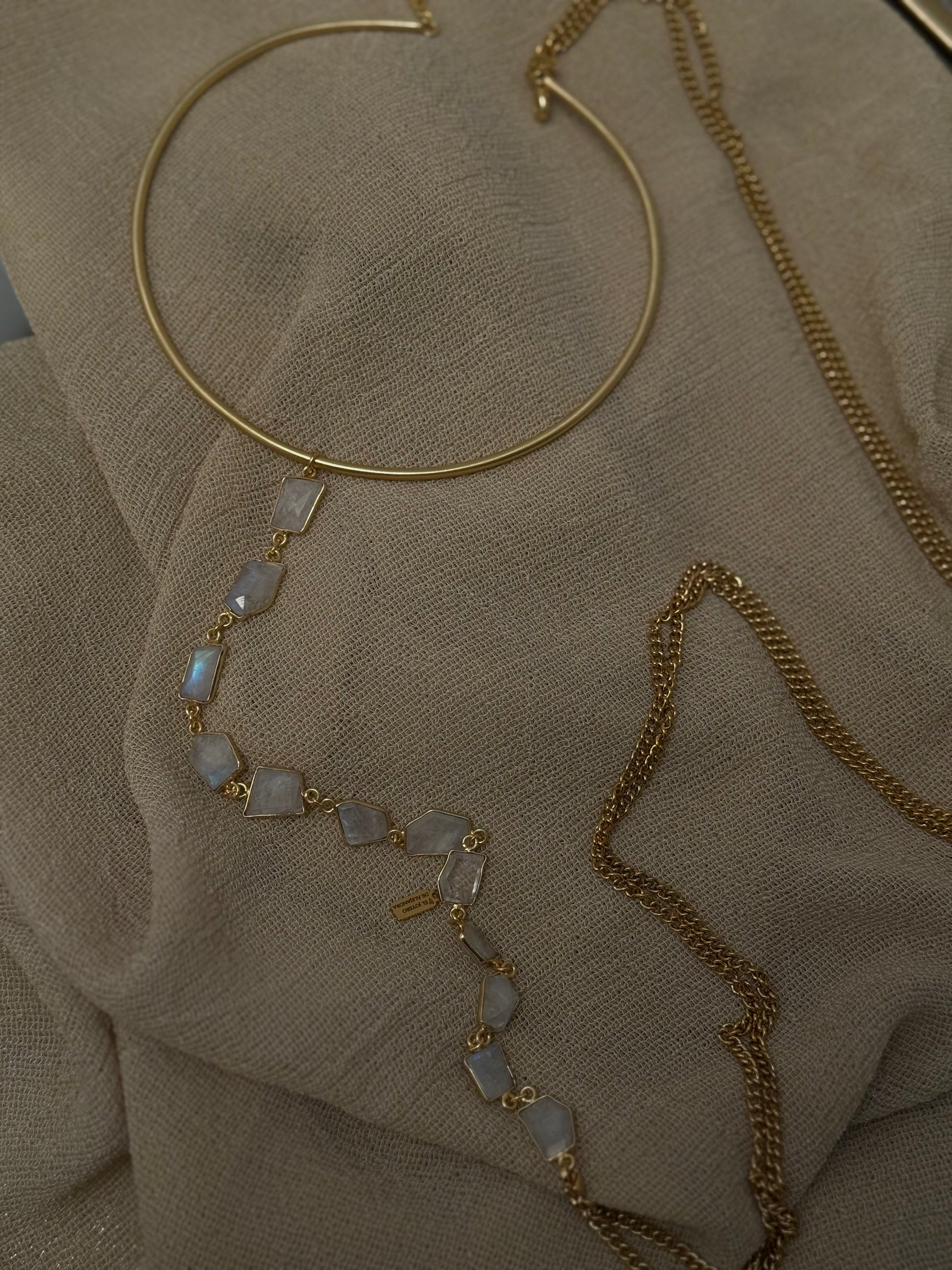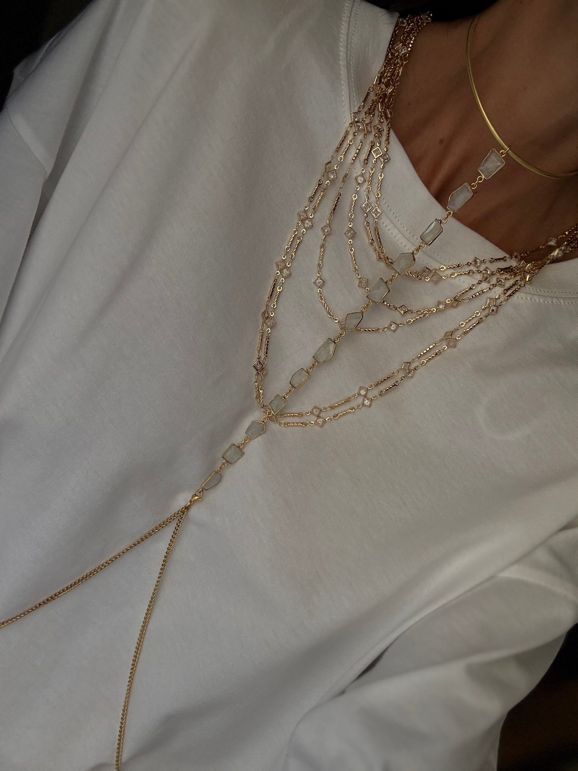 abraza tu cuerpo con sutiles cadenas de oro, dejando caer por tu escote nuestras piedras naturales engarzadas una a una, creando una hilera realmente bonita. De base al cuello, un choker fino que realzará tu belleza natural sin necesidad de mucho más. Morirás de amor ✨
