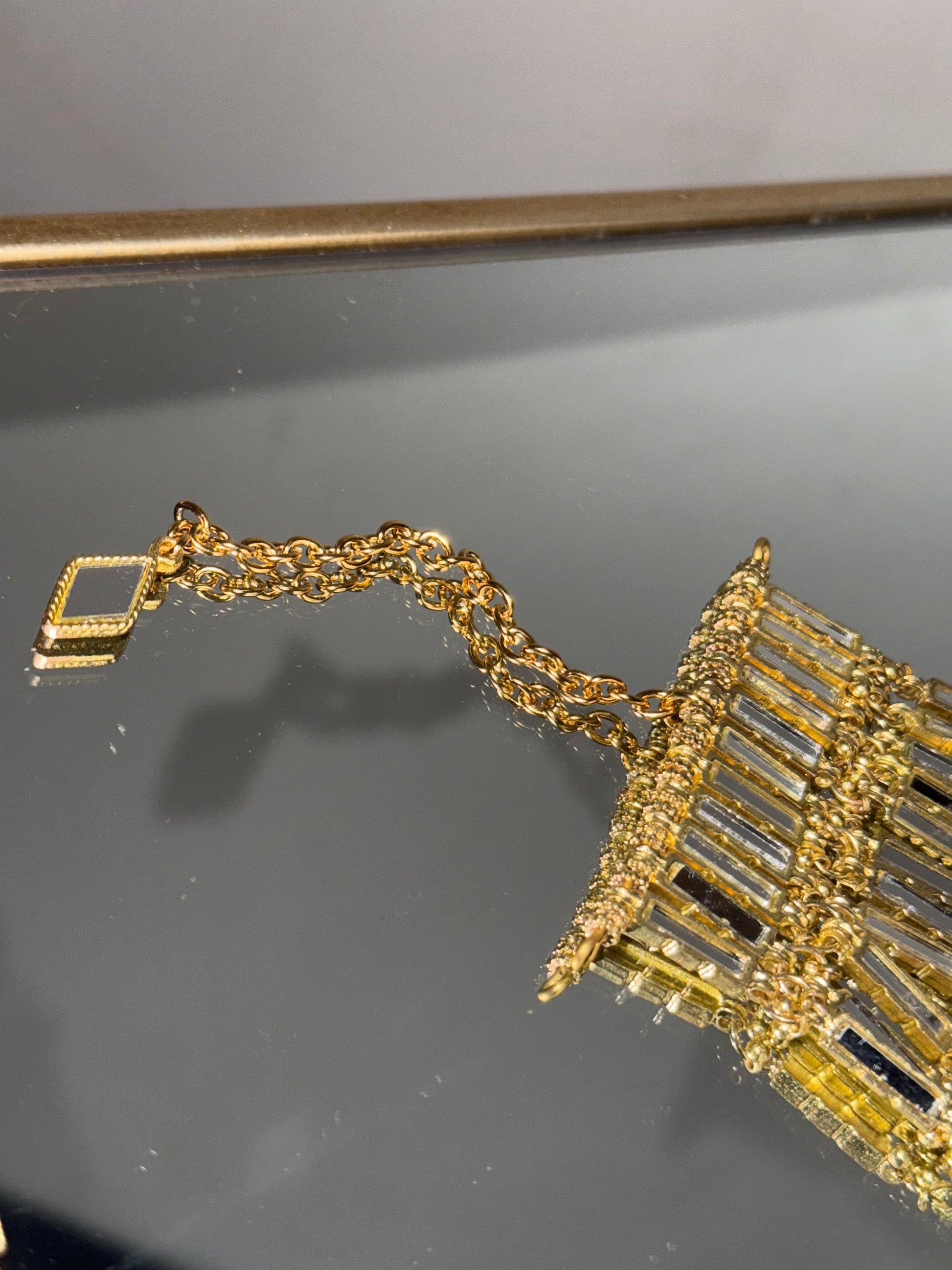 Espectacular pieza al cuello, donde el poder y la sofisticación es su mejor descripción. Trebajada a partir de piezas de espejo o terminación BLACK & oro, que apuesta por bordear tu cuello creando un efecto visual con aire Vintage y escultural.