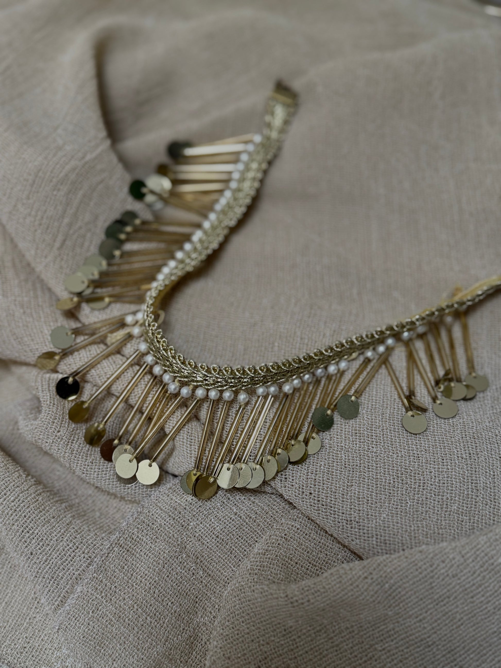 Pieza artesanal trabajada a partir de cuentas en tono dorado con detalles tejidos con hilos metalizados y apliques móviles en forma de discos.