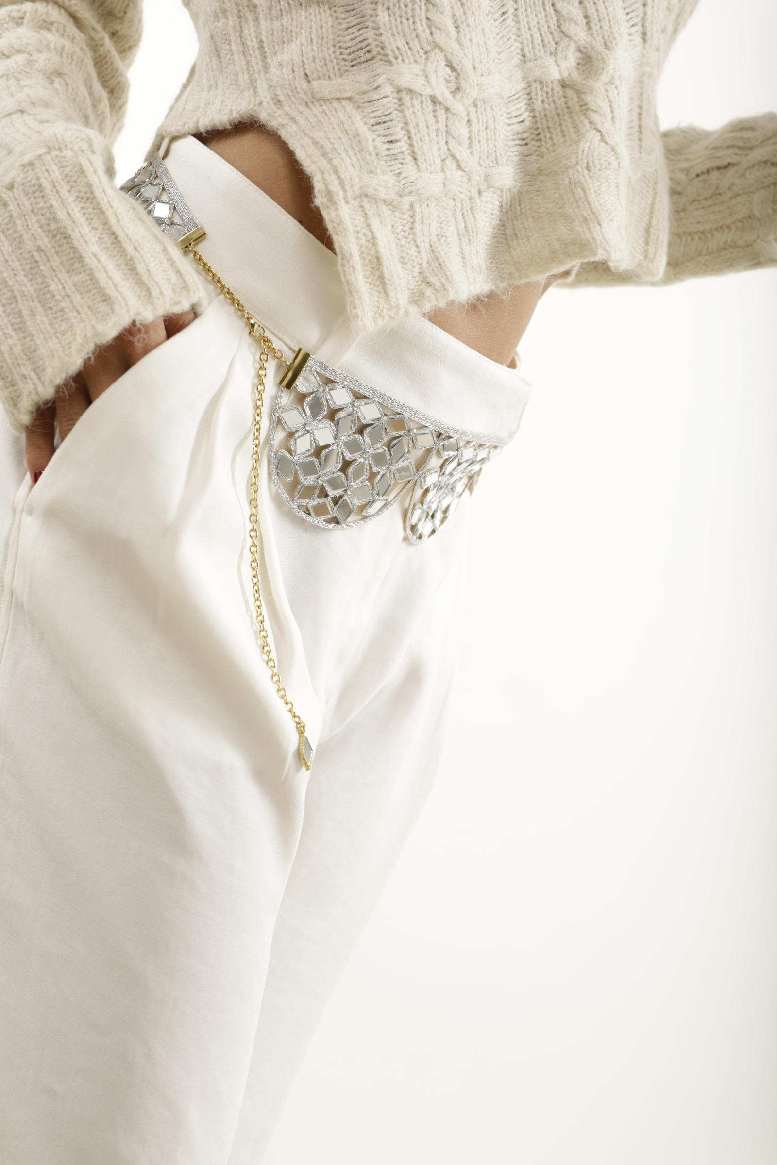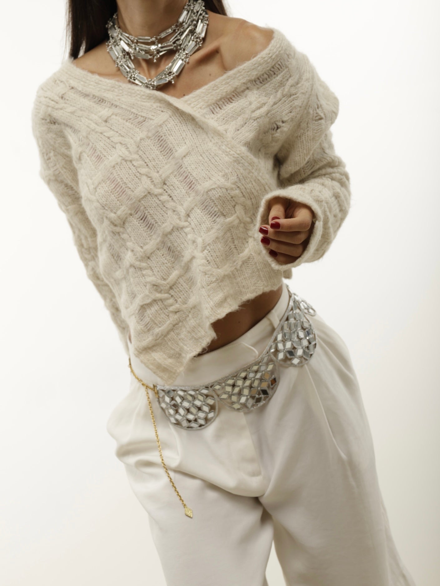 Pieza artesanal trabajada a partir de hilaturas metalizadas y mini piedras de espejo irregulares.