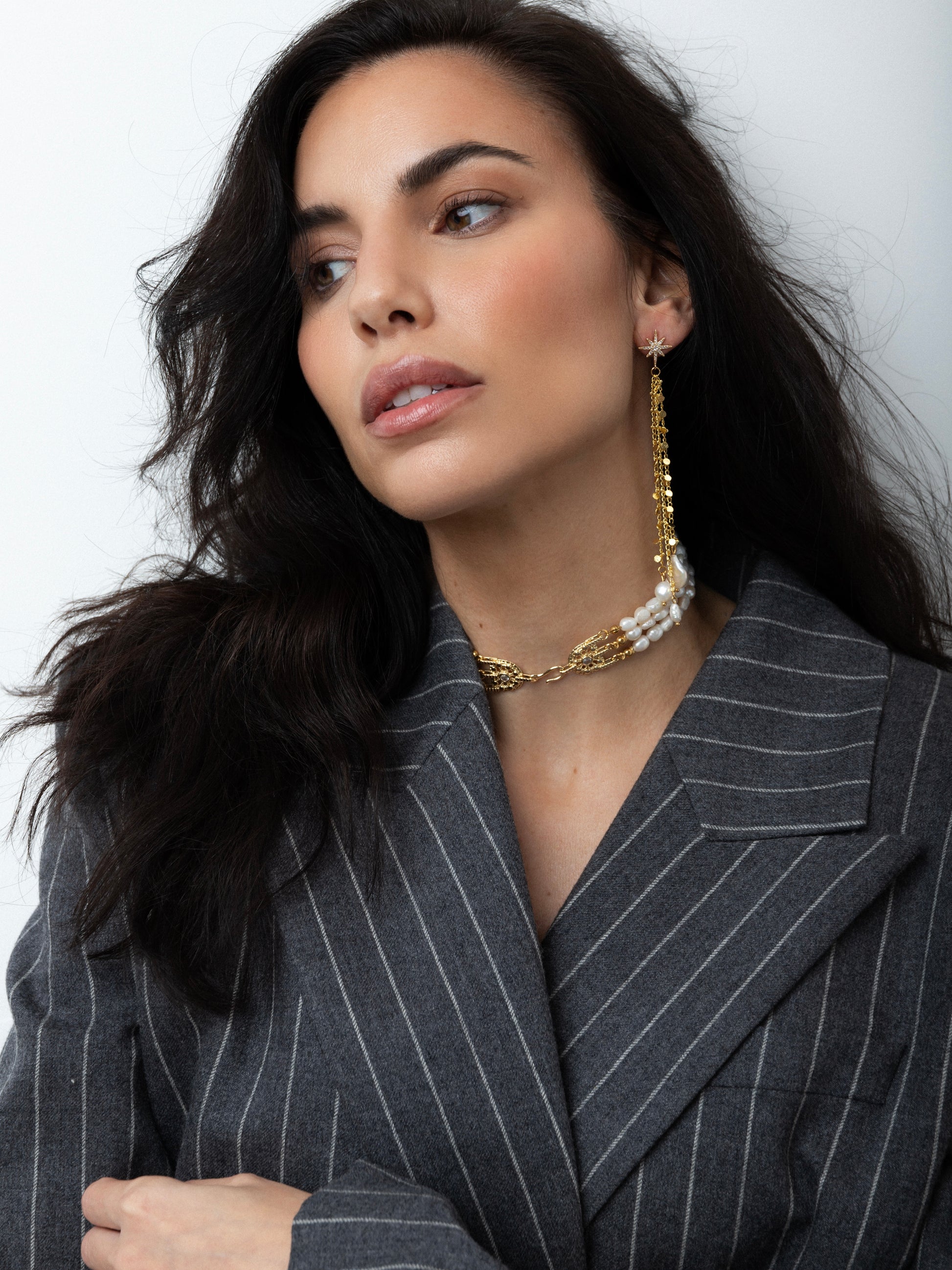 De esta, cuelgan 3 lágrimas con destellos aportando movimiento & longitud, algo brutal al look.