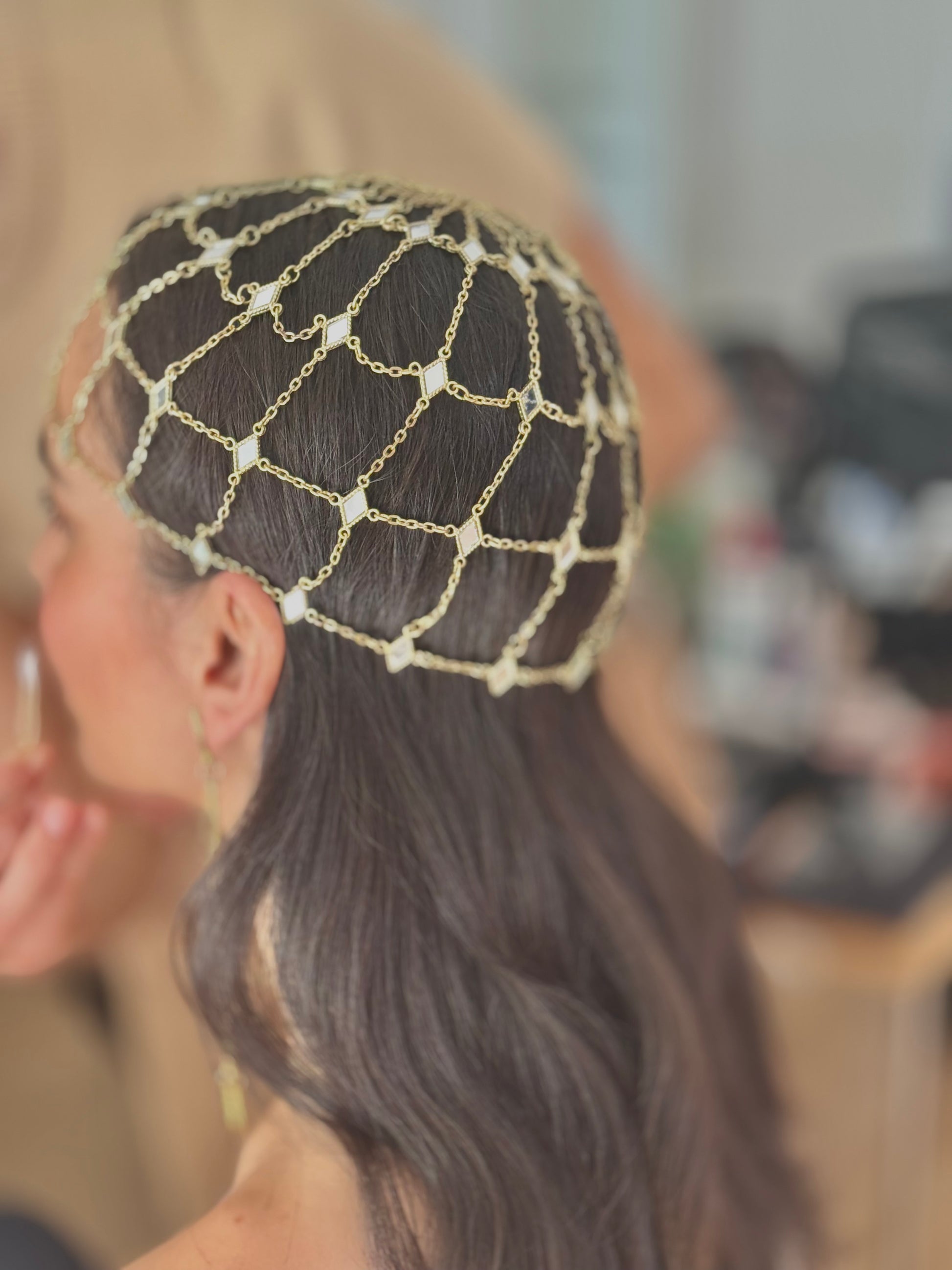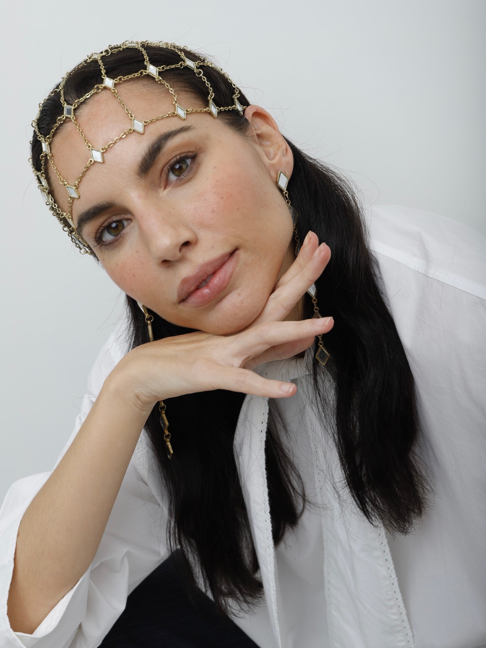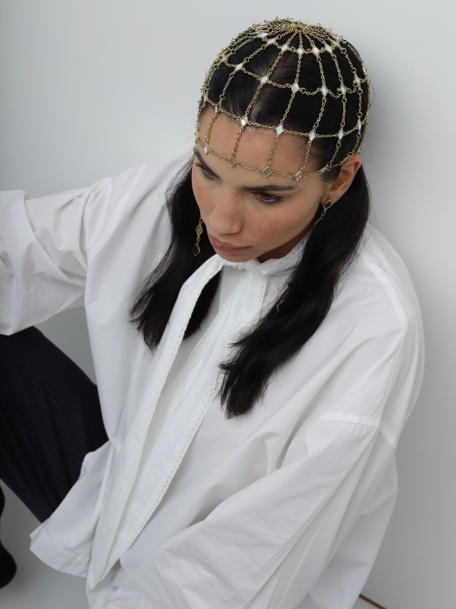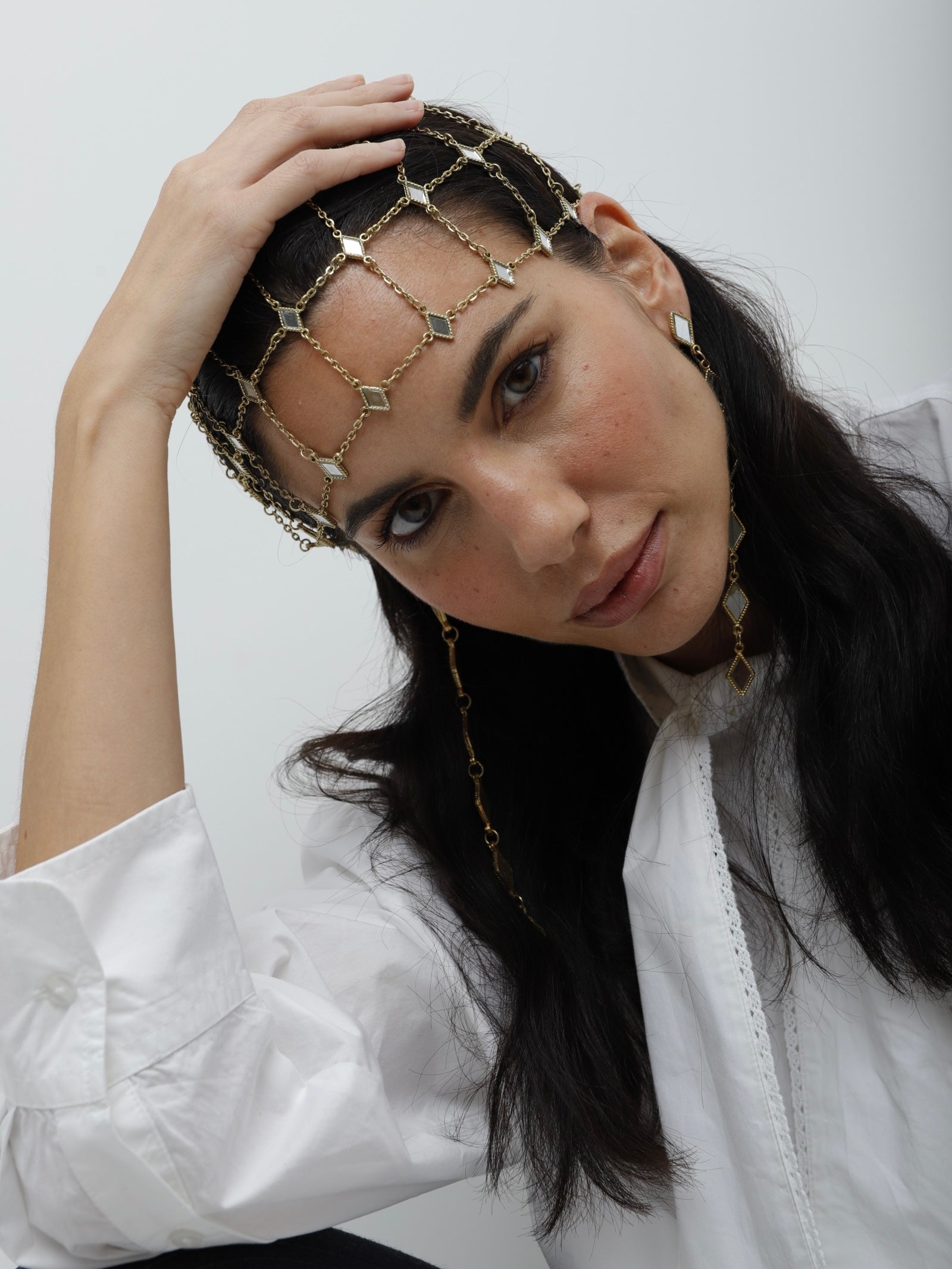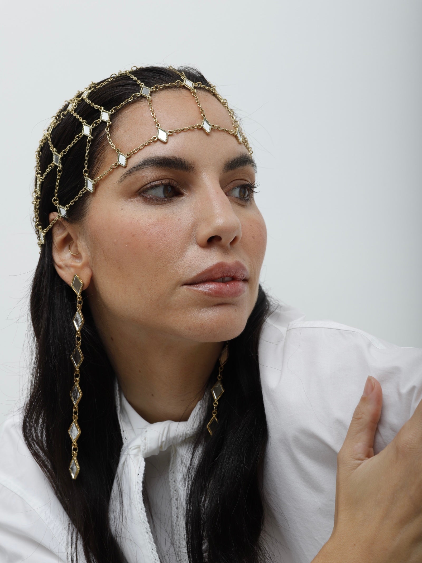 Mini cristales de espejo en forma de rombo de latón, unidas una a una creando líneas sutiles, formando de casco para aportar carácter y personalidad infinita a tu outfit